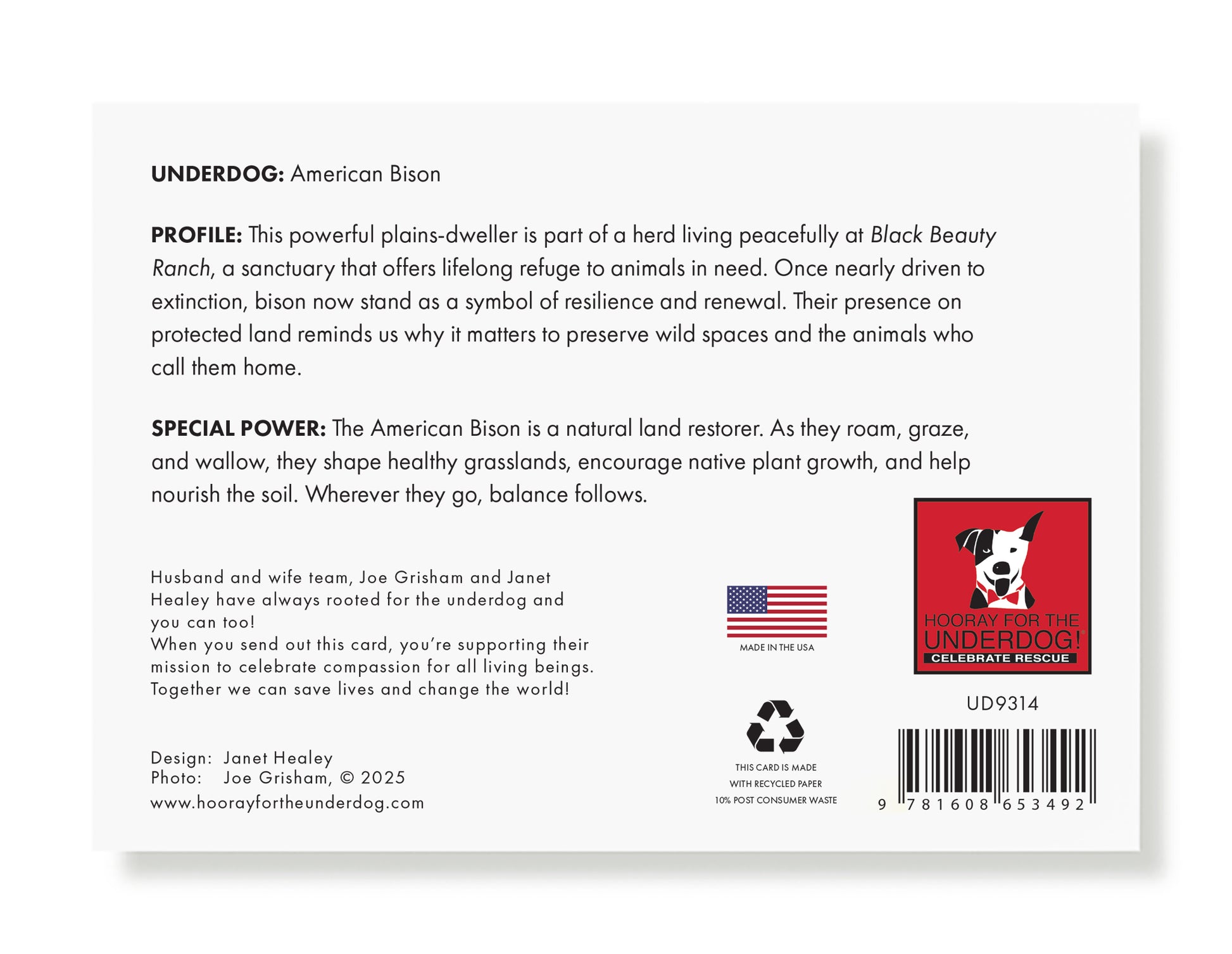 Ten single folded greeting cards with envelopes. Printed responsibly in the USA on 5 x 7" premium cover weight, recycled paper stock. Card back features the Underdogs' profile.