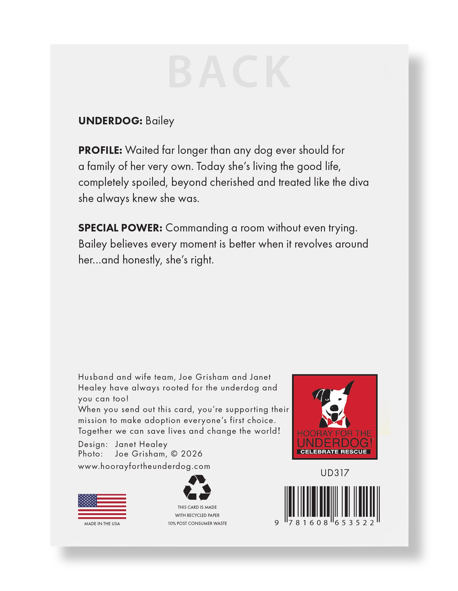 Waited far longer than any dog ever should for a family of her very own. Today she’s living the good life, completely spoiled, beyond cherished and treated like the diva she always knew she was. |