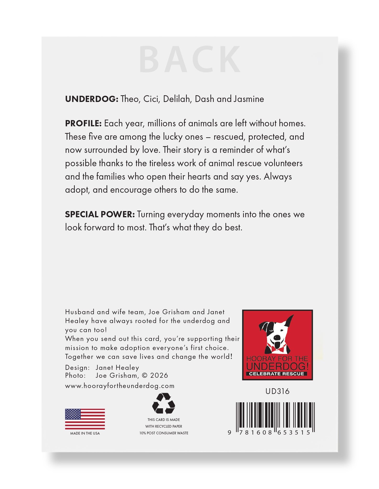 Theo, Cici, Delilah, Dash and Jasmine Greeting Card